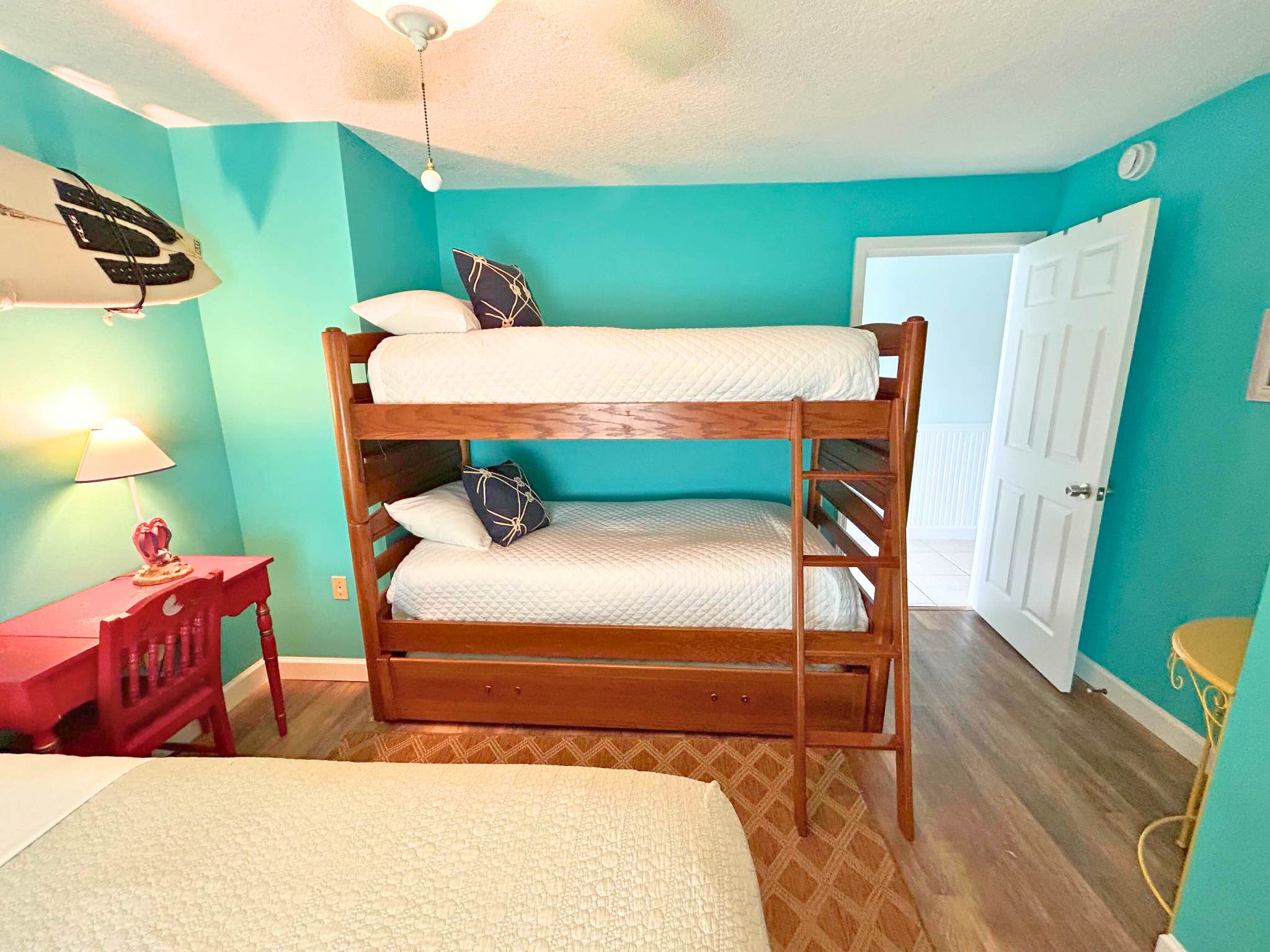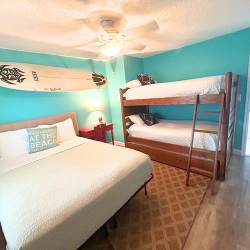 Sleep soundly in two private bedrooms—each with its own bathroom. One features an ultra-soft king bed, and the other offers cozy bunk beds, perfect for kids or extra guests. Whether you're here for a weekend or a month, you'll have the space and comfort to truly relax.